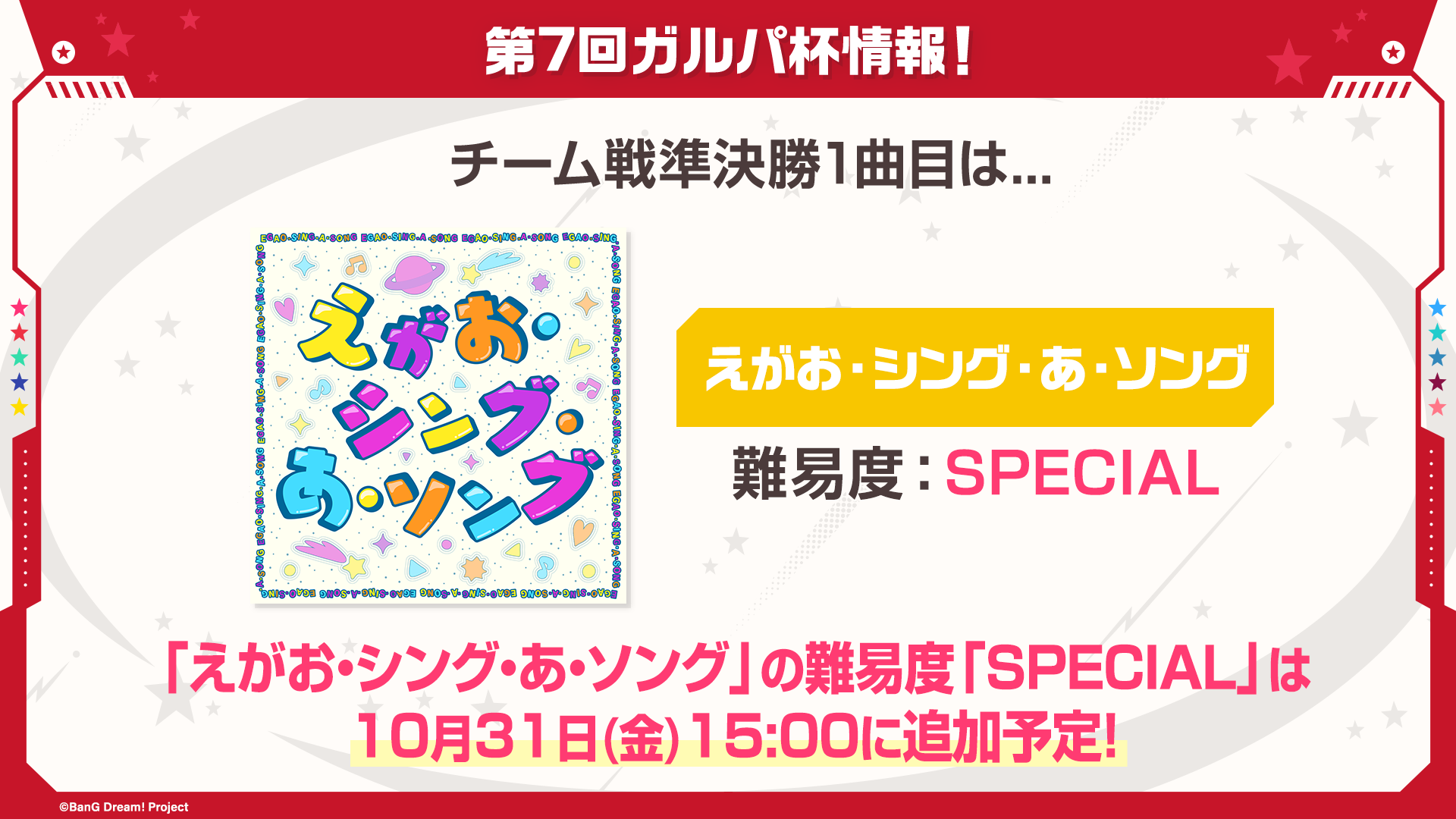 第7回ガルパ杯のチーム戦準決勝の1曲目が「えがお・シング・あ・ソング」(難易度:SPECIAL)に決定いたしました。