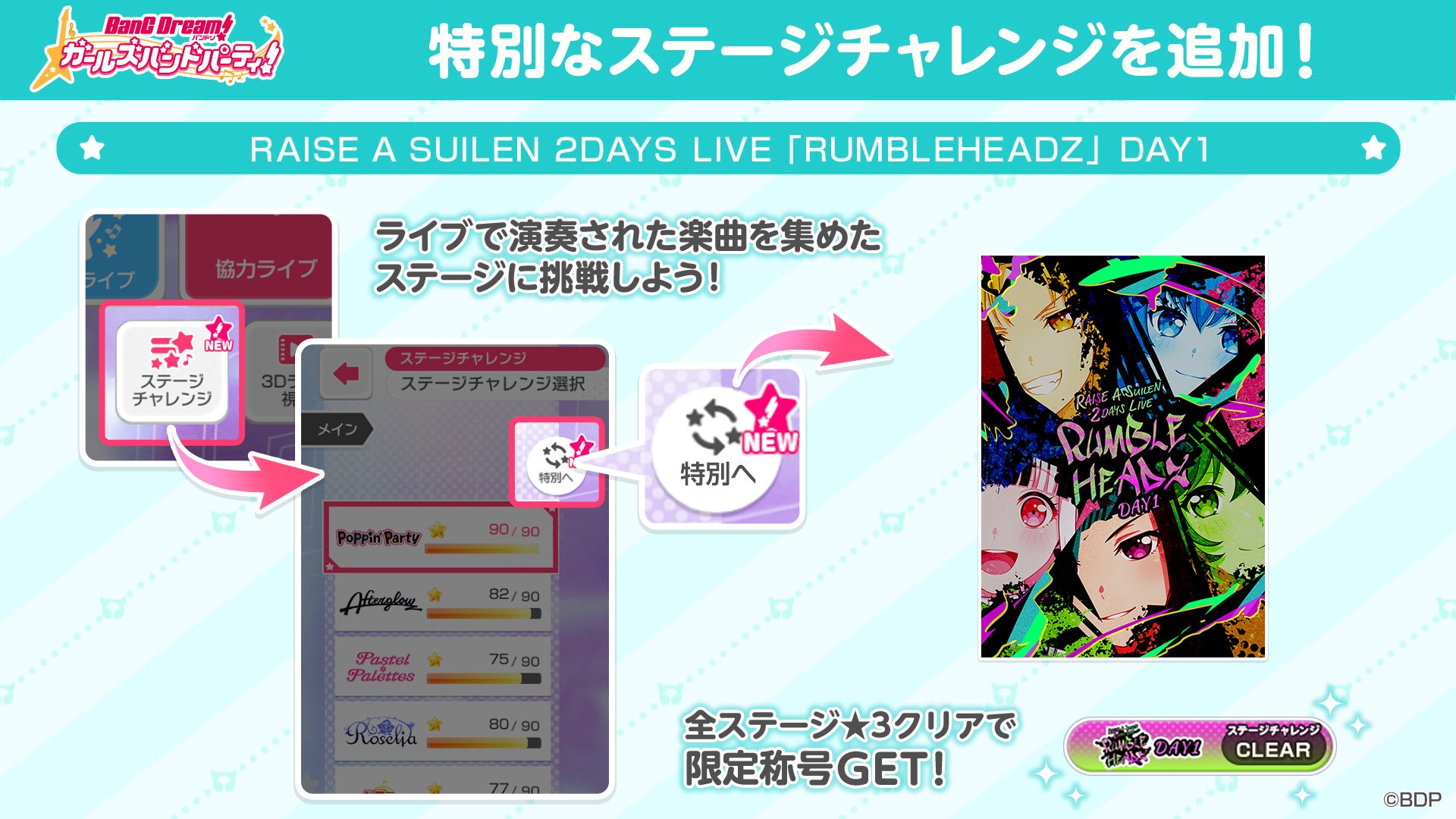 - 【新情報】「ガルパ」にて、ライブで演奏した楽曲を集めた特別ステージが、ステージチャレンジ機能に追加!