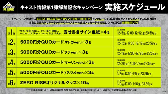 キャンペーン期間中にZERO RISE公式Xアカウント(https://x.com/ZERORISE_PJ)をフォローして、応募対象ポストをリポストでご応募可能です。
