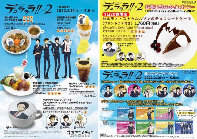 「成田アニメデッキ」のイートインレストランでは、オリジナルのコラボメニューも提供します。個性的なそれぞれのキャラクターをイメージしたフードメニューや、各キャラクターの顔がプリントされたラテが楽しめます。とくにオススメなのは、「竜ヶ峰帝人のみそだれ焼き鳥丼」。帝人の好物である「みそだれ焼き鳥」を丼ぶりにしたメニューで、描き下ろしイラストや、トレードマークの携帯をプリントした最中はすべて食べられます。さらに、バレンタイン特別メニューとして、「セルティ・ストゥルルソンのチョコレートケーキ(プリントラテ付き)」を2月10日(木)~20日(日)まで1日限定20食提供いたします。この時期だけしか味わえないお得なデザートメニューですので、お楽しみに!また、期間中に『デュラララ!!×2』コラボメニューを1品ご注文につき、オリジナルコースターを7種ランダムから1枚お渡しします。さらに一会計につき3,500円(税込)ご注文ごとに1枚、オリジナルのランチョンマットもランダムでプレゼントします。ノベルティランチョンマットの絵柄は全部で7種類。第1弾は2月10日(木)~、第2弾は4月1日(金)~配布となりますので、ぜひチェックしてくださいね。