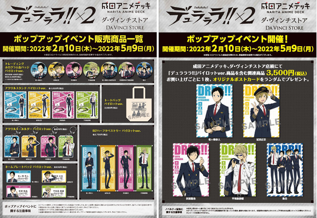 TVアニメ『デュラララ!!』は、電撃文庫(KADOKAWA)より刊行中の、成田良悟によるライトノベルシリーズを原作とし、2010年から2016年にかけてTV放映・劇場上映された、今なお人気の作品で、さまざまなキャラクターが東京・池袋を舞台に織りなす群像劇です。ポップアップイベントでは、『デュラララ!!×2』と「成田アニメデッキ」「ダ・ヴィンチストア」のコラボレーションとして、パイロット衣装を身にまとったキャラクター達の描き下ろしイラストグッズを先行販売するほか、成田アニメデッキではコラボフードやドリンクの提供も行います。