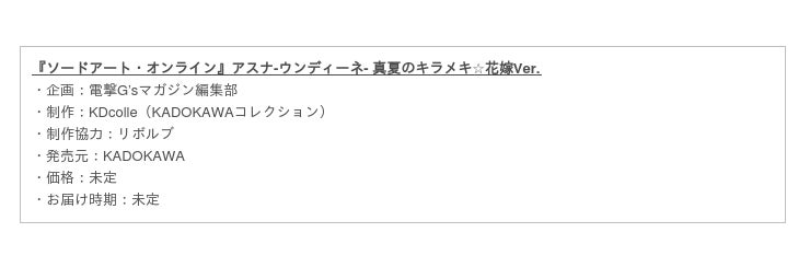 『ソードアート・オンライン』アスナ-ウンディーネ- 真夏のキラメキ☆花嫁Ver.について