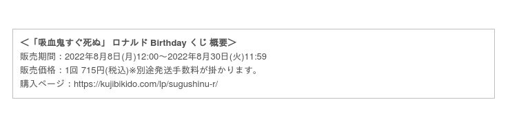 株式会社KADOKAWA(本社:東京都千代田区、代表取締役社長:夏野 剛 以下KADOKAWA)は、運営するオンラインくじサービス「くじ引き堂」において、TVアニメ『吸血鬼すぐ死ぬ』オリジナル商品が手に入る「吸血鬼すぐ死ぬ」 ロナルド Birthday くじ」を、2022年8月8日(月)12時より販売します。