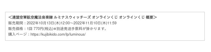 株式会社KADOKAWA(本社:東京都千代田区、代表取締役社長:夏野 剛 以下KADOKAWA)は、運営するオンラインくじサービス「くじ引き堂」において、TVアニメ『連盟空軍航空魔法音楽隊 ルミナスウィッチーズ』オリジナル商品が手に入る「連盟空軍航空魔法音楽隊 ルミナスウィッチーズ オンラインくじ」を、2022年10月13日(木)12時より販売します。