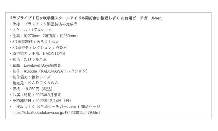 株式会社KADOKAWA(本社:東京都千代田区、代表取締役社長:夏野剛 以下KADOKAWA)は、「“手に取れる”新しい物語」をコンセプトとしたフィギュアブランド「KDcolle(KADOKAWAコレクション)」の新作アイテムとして、『ラブライブ!虹ヶ咲学園スクールアイドル同好会』桜坂しずく お台場ビーチガールver.フィギュアの予約受付を、カドカワストア、キャラアニ.com、エビテン限定で2022年10月17日(月)より開始いたしました。予約受付は2022年12月4日(日)までとなります。