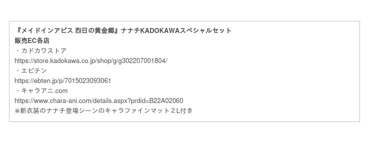 また、カドカワストア、エビテン、キャラアニ.com限定で新衣装のナナチ登場シーンのキャラファインマット2LがセットされたKADOKAWAスペシャルセットも販売されますので、こちらもお見逃しなく!