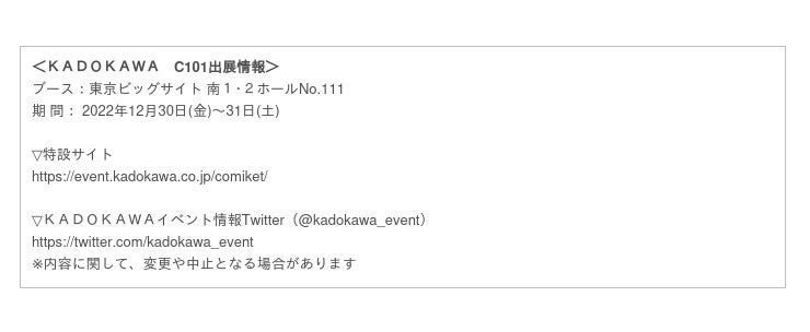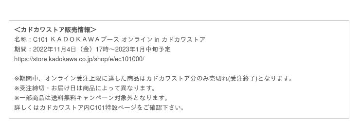 KADOKAWAの公式オンラインショップ カドカワストアでは、ブースで販売する商品の先行受注を開始致しました。商品情報は順次追加になりますので、カドカワストア内C101特設ページをご確認ください。また、C101商品を対象とした送料無料キャンペーンも実施しているので、この機会をお見逃しなく!