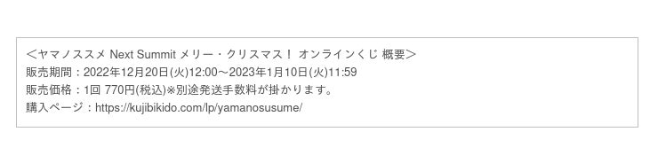 株式会社KADOKAWA(本社:東京都千代田区、代表取締役社長:夏野 剛 以下KADOKAWA)は、運営するオンラインくじサービス「くじ引き堂」において、TVアニメ『ヤマノススメ Next Summit』のオリジナル商品が手に入る「ヤマノススメ Next Summit メリー・クリスマス!オンラインくじ」を、2022年12月20日(火)12時より販売します。