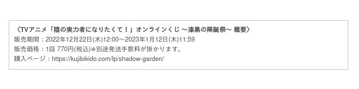 株式会社KADOKAWA(本社:東京都千代田区、代表取締役社長:夏野 剛 以下KADOKAWA)は、運営するオンラインくじサービス「くじ引き堂」において、TVアニメ『陰の実力者になりたくて!』オリジナル商品が手に入る<TVアニメ「陰の実力者になりたくて!」オンラインくじ~漆黒の降誕祭~>を、2022年12月22日(木)12時より販売します。