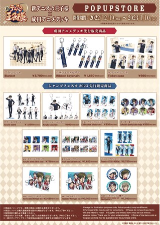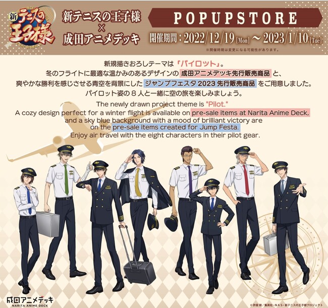 本ポップアップイベントでは、越前リョーマ、手塚国光、不二周助、跡部景吾、木手永四郎、白石蔵ノ介、幸村精市、君島育斗の8人がパイロットに扮した描き下ろしイラストを使用したグッズを販売いたします。成田アニメデッキ先行販売のグッズに加え、「ジャンプフェスタ2023」で販売予定のグッズも同時展開いたします。