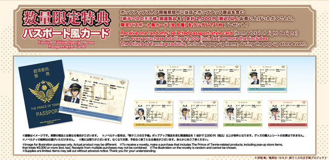 『新テニスの王子様』ポップアップ商品を含む関連商品を2,000円(税込)お買い上げごとに、グッズ購入特典として、「限定パスポート風カード」(全8種)をランダムで1枚プレゼントいたします。本物のパスポートと同サイズのカードに各キャラクターの詳細データが掲載された、こだわりのデザインをお楽しみください!