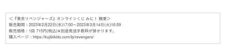 株式会社KADOKAWA(本社:東京都千代田区、代表取締役社長:夏野 剛 以下KADOKAWA)は、運営するオンラインくじサービス「くじ引き堂」において、TVアニメ『東京リベンジャーズ』オリジナル商品が手に入る『東京リベンジャーズ』オンラインくじ みに!を、2023 年2月22日(水)17時より販売します。