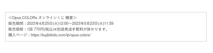 株式会社KADOKAWA(本社:東京都千代田区、代表取締役社長:夏野 剛 以下KADOKAWA)は、運営するオンラインくじサービス「くじ引き堂」において、TVアニメ「Opus.COLORs」オリジナル商品が手に入る「Opus.COLORs オンラインくじ」を、2023年4月25日(火)12時(正午)より販売します。