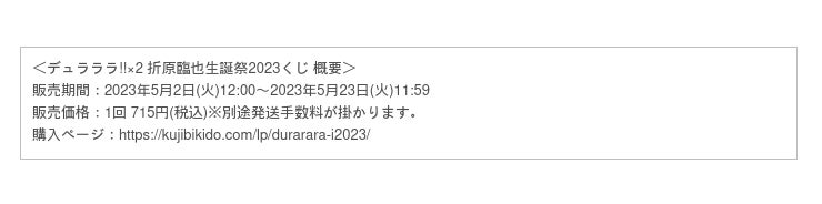 株式会社KADOKAWA(本社:東京都千代田区、代表取締役社長:夏野 剛 以下KADOKAWA)は、運営するオンラインくじサービス「くじ引き堂」において、TVアニメ『デュラララ!!×2』オリジナル商品が手に入る「デュラララ!!×2 折原臨也生誕祭2023くじ」を、2023年5月2日(火)12時(正午)より販売します。