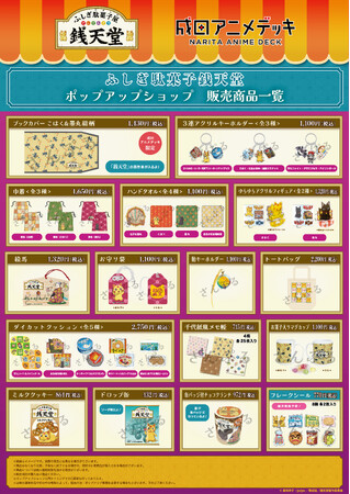 この会場でしか手に入らないポップアップショップ限定の「銭天堂」原作本が入るブックカバーを成田アニメデッキ版、ダ・ヴィンチストア&九州アニメデッキ版の2種類販売。その他、3連アクリルキーホルダー、ダイカットクッション、巾着、缶バッジ付チョコクランチなどの販売を行います。