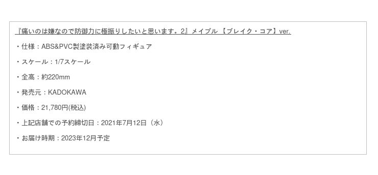 株式会社KADOKAWA(本社:東京都千代田区、代表取締役社長:夏野剛 以下KADOKAWA)は、「“手に取れる”新しい物語」をコンセプトとしたフィギュアブランド「KDcolle(KADOKAWAコレクション)」の新作アイテムとして、『痛いのは嫌なので防御力に極振りしたいと思います。2』メイプル 【ブレイク・コア】ver.、カドカワストア、エビテン等で5月16日(火)より開始いたしました。本フィギュアの予約締切は7月12日(水)を予定しています。