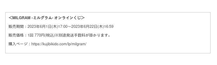 株式会社KADOKAWA(本社:東京都千代田区、代表取締役社長:夏野 剛 以下KADOKAWA)は、運営するオンラインくじサービス「くじ引き堂」において、『MILGRAM -ミルグラム-』のオリジナル商品が手に入る『MILGRAM -ミルグラム- オンラインくじ』、2023年6月1日(木)17時より販売します。