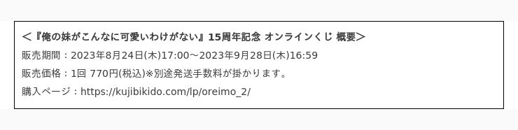 株式会社KADOKAWA(本社:東京都千代田区、取締役 代表執行役社長 CEO:夏野 剛、以下 KADOKAWA)は、運営するオンラインくじサービス「くじ引き堂」において、電撃文庫作品『俺の妹がこんなに可愛いわけがない』オリジナル商品が手に入る<『俺の妹がこんなに可愛いわけがない』15周年記念 オンラインくじ>を、2023年8月24日(木)17時より販売します。