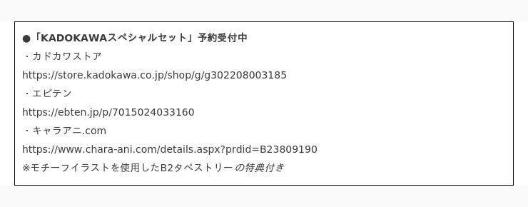 カドカワストア、エビテン、キャラアニ.comでは、モチーフイラストを使用したB2タペストリーが付属した特典つき「KADOKAWAスペシャルセット」も予約受付中です。