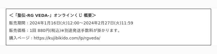 株式会社KADOKAWA(本社:東京都千代田区、取締役 代表執行役社長 CEO:夏野 剛、以下 KADOKAWA)は、運営するオンラインくじサービス「くじ引き堂」において、<「聖伝-RG VEDA-」オンラインくじ>を、2024年1月16日(火)12時より販売します。