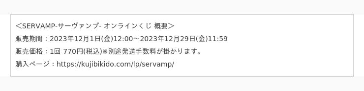 株式会社KADOKAWA(本社:東京都千代田区、取締役 代表執行役社長 CEO:夏野 剛、以下 KADOKAWA)は、運営するオンラインくじサービス「くじ引き堂」において、コミックス「SERVAMP-サーヴァンプ-」オリジナル商品が手に入る<SERVAMP-サーヴァンプ- オンラインくじ>を、2023年12 月1日(金)12時より販売します。
