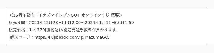 株式会社KADOKAWA(本社:東京都千代田区、取締役 代表執行役社長 CEO:夏野 剛、以下 KADOKAWA)は、運営するオンラインくじサービス「くじ引き堂」において、『イナズマイレブンGO』オリジナル商品が手に入る<15周年記念「イナズマイレブンGO」オンラインくじ>を、2023年12月23日(土)12時より販売します。