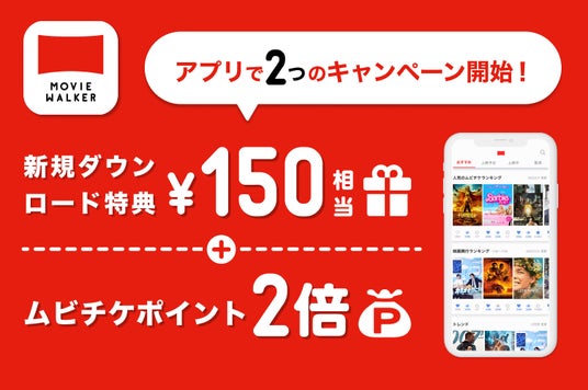 株式会社ムービーウォーカー(代表取締役社長:五十嵐淳之)は、6月3日(月)より、映画アプリMOVIE WALKERの2つのキャンペーン【新規ダウンロード特典150円相当配布】と【アプリでポイント2倍キャンペーン】をスタートしました。
