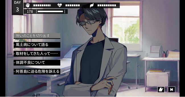 瀬戸内海のとある島で、思わぬ形で呪いを受けてしまった主人公。島を調査し、空海伝説と邪神崇拝の謎を追い、呪いを解いていきましょう。
