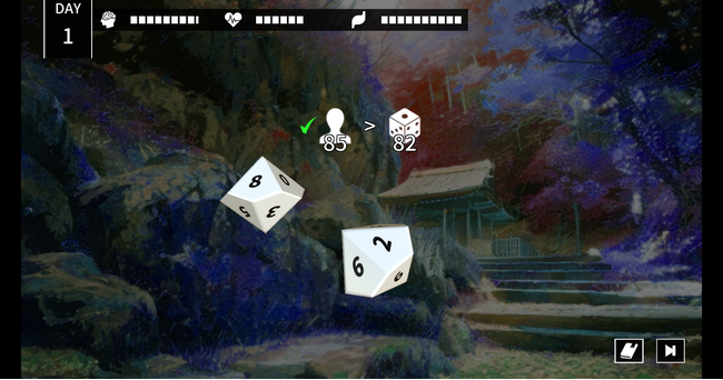 本作では、通常の選択肢選びのほか、重要な場面において、行動の成否がダイスロールによって決まることがあります。