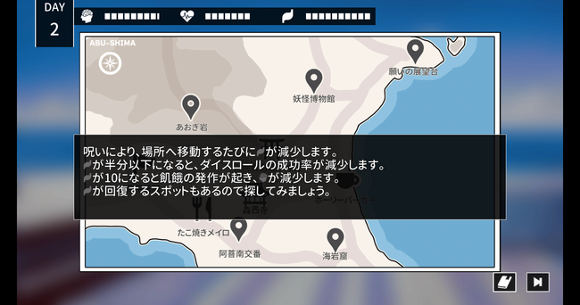 島を探索して「満腹度」が減っていくと、恐ろしい呪いの発作が起きたり、ダイスロール成功率が低下したりします。