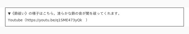 物語の中で、ヒロインの澪が自宅の竹やぶと鈴の音のおかげで間一髪「闇ハラ」から逃れられるシーンは印象的。