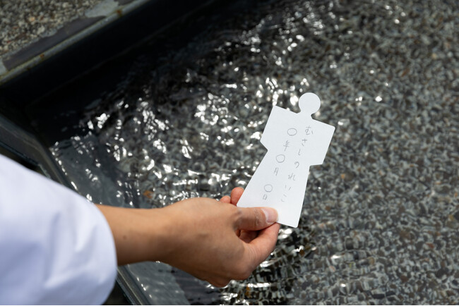 形代(かたしろ)とは、人の形を模した人形(ひとがた)のこと。形代に知らず知らずのうちに身についてしまったご自身の罪や穢れを移し、水に流すことで身を祓い清めることができます。