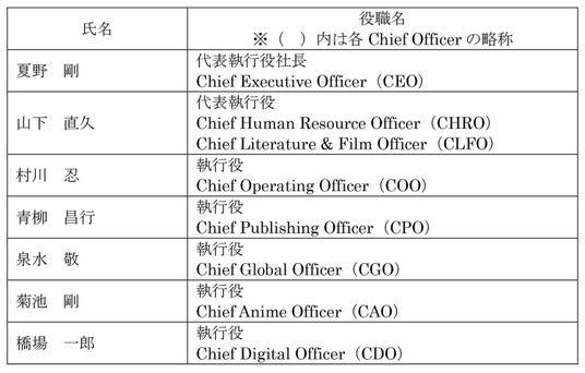 株式会社KADOKAWA(本社:東京都千代田区、取締役 代表執行役社長 CEO:夏野剛、以下 当社)は、2024年6月18日開催の第10期定時株主総会において、当社取締役の選任が決議されたことをお知らせいたします。また、その後に開催された臨時取締役会において、執行役および執行役員体制を決定いたしました。