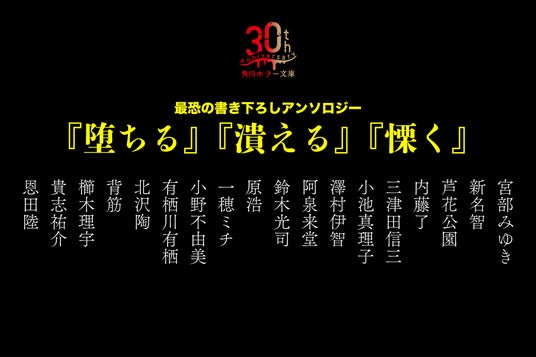 そして30周年の集大成として、超豪華執筆陣による最恐の書き下ろしアンソロジー『堕ちる』『潰える』『慄く』を企画しました。鈴木光司氏、小池真理子氏、貴志祐介氏、澤村伊智氏などの角川ホラー文庫お馴染みの人気作家に加えて、角川ホラー文庫に初登場の一穂ミチ氏、背筋氏など、今考えうる「最恐」が集結した最強のアンソロジーとなっています。先述の通り、すべての作品が初出し・完全書き下ろしです。時代もモチーフも様々ではありますが、令和における「あらゆる恐さのニュージャンル」を体現するようなアンソロジーになりました。