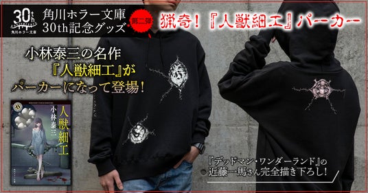 故・小林泰三氏の名作『人獣細工』がパーカーになって登場します!悲劇のヒロイン・継ぎはぎ娘の手術痕を、スタイリッシュにデザインしました。イラストは、『デッドマン・ワンダーランド』の近藤一馬氏の完全描き下ろし! 角川文庫『人獣細工』のカバーイラストも手掛けた近藤氏が、作品の世界観を美しく表現しました。心臓に縫い付けられた角川ホラー文庫ロゴや、フードを上げると見える背骨も、恐ろしいのにかっこいい!在庫限りなのでお買い忘れのなきように!