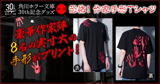 豪華作家陣の<実寸大の手形>をプリントした「恐怖! 作家手形Tシャツ」。発売直後からSNS等で大きな話題となり、発売2日で全サイズが完売、緊急重版となりました。手形のメンバーは、綾辻行人氏、有栖川有栖氏、小野不由美氏、貴志祐介氏、京極夏彦氏、小池真理子氏、鈴木光司氏、宮部みゆき氏、という日本ホラー界を牽引する超豪華な8名!血まみれの手が背中を這い上がってくる……ようにも見えるデザインは、迫力満点です!実際に着てホラーイベントにいくも良し、実寸大手形と自分の手を合わせて推し作家の実在を確かめるも良し! 楽しみ方無限大の角川ホラー文庫オリジナルTシャツです。