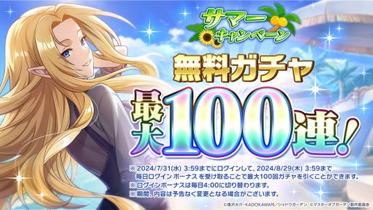 7月11日(木)より、サマーキャンペーンを開催します。キャンペーン期間中、30日間ログインすると、最大100連分のガチャチケットをゲットできます。さらに、期間内にガチャチケット100枚を使い切ると、SS確定ガチャチケットをプレゼント! この夏限定のキャンペーンをお見逃しなく!