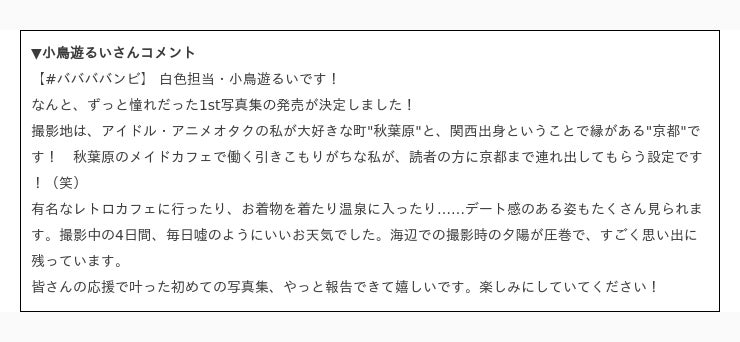 本写真集は「一目惚れしたメイドの女の子を連れ出して、初めての旅行へ」というコンセプトのもと、旅行先の京都で過ごす非日常感を存分に堪能できる一冊になっています。水着やランジェリー、メイド服から浴衣までバリエーション豊かな15着以上の衣装でのカットに加え、初めてのお風呂カットなど、小鳥遊るいのこれまで以上の愛らしさ、可愛らしさが表現されています。さらに今までは披露されてこなかった彼女の新たな一面を垣間見られるショットもあり、至極の1st写真集となりました。