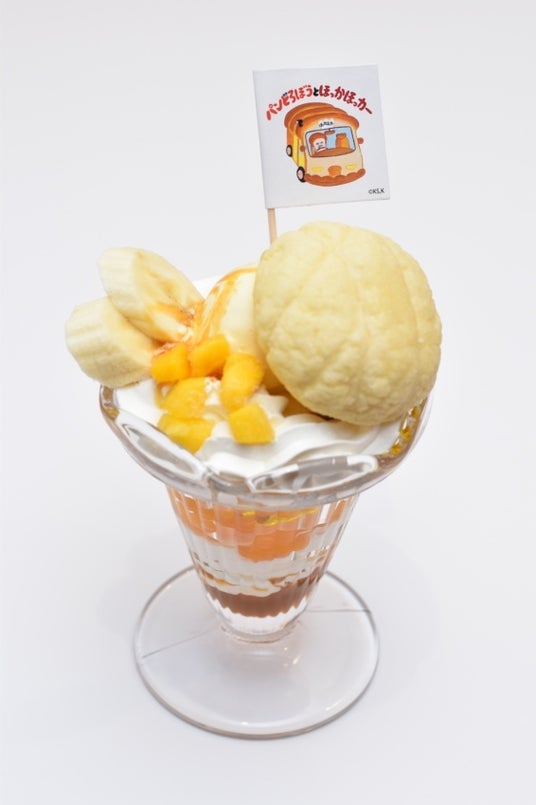 バナナやミニメロンパンを使った、ほっかほっカーをイメージしたパフェ。フラッグ付き。