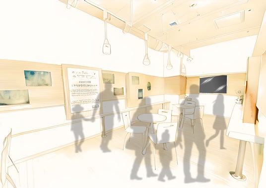 店内のイートインスペースには、KADOKAWAが推進する文化芸術による地域振興プロジェクト「武蔵野回廊プロジェクト」の一環として、コミュニティスペース「むさしのもん|Musashino Mon」を併設します。このスペースは、武蔵野文化を知る入口として「門」と名付けられ、ファミリーマートの来店者が休憩しながら、施設が所在する武蔵野の文化を学ぶことができる場所となっています。スペースのデザインは、武蔵野図屏風から着想を得ており、国産木材を使用して草原から雑木林へと変遷する武蔵野台地を表現しています。