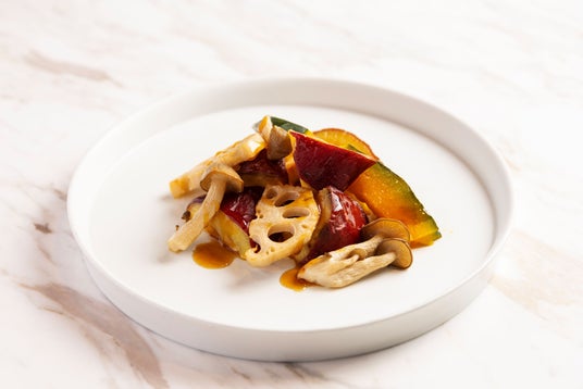 左上から右上の順に)サツマイモと根菜の照り焼きソース、栗カボチャの冷製スープ 豆乳仕立て、