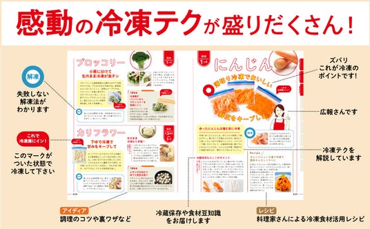 「焼き魚は温かいうちに冷凍したほうがいい」「レタスはホイルに包んで冷凍できる」……など、便利調理テクや解凍・冷凍保存の知恵、うまみを落とさず冷凍焼けを防ぐコツ、豆知識やレシピが盛りだくさん。