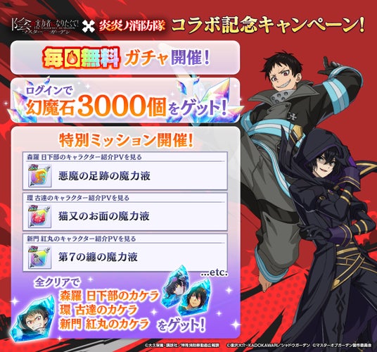 期間中、『炎炎ノ消防隊』を含むキャラが引ける毎日無料ガチャを開催するほか、ログインするだけでガチャ10連分相当の幻魔石をプレゼント!