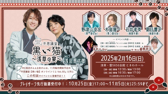 株式会社KADOKAWA(本社:東京都千代田区、取締役 代表執行役社長 CEO:夏野剛、以下KADOKAWA)が運営するニコニコチャンネル「浅沼晋太郎・土田玲央『不思議堂【黒い猫】』」は、2025年2月16日(日)に浅草・雷5656会館にて、ファンイベント「浅沼晋太郎・土田玲央『不思議堂【黒い猫】』~浅草の宴~」を開催します。また、2024年11月5日(火)よりオンラインくじサービス「くじ引き堂」にて、「モダン和装」をテーマにしたオリジナルグッズが手に入る「浅沼晋太郎・土田玲央『不思議堂【黒い猫】』オンラインくじ Vol.02」を販売いたします。
