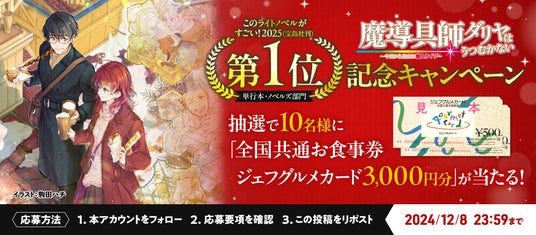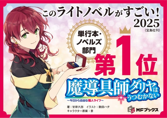 株式会社KADOKAWA(本社:東京都千代田区、取締役 代表執行役社長 CEO:夏野剛)の新文芸レーベル「MFブックス」より発売している『魔導具師ダリヤはうつむかない ~今日から自由な職人ライフ~』が、宝島社発行のライトノベルガイドブック『このライトノベルがすごい!2025(宝島社刊)』にて「単行本・ノベルズ部門1位」に選出されましたことをご報告いたします。