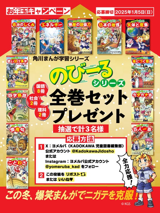 株式会社KADOKAWA(本社:東京都千代田区、取締役 代表執行役社長 CEO:夏野剛)は、角川まんが学習シリーズ「のびーる」シリーズで「角川まんが学習シリーズ のびーるシリーズ お年玉キャンペーン」を実施中です。現在発売中の「のびーる国語」8冊、「のびーる社会」2冊、「のびーる理科」2冊の合計12冊全巻セットが当たります。