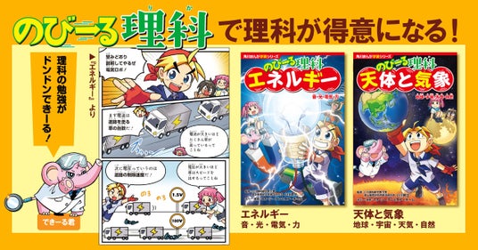 角川まんが学習シリーズ「のびーる」シリーズは関連シリーズが累計540万部を突破した、小学生に大人気の『どっちが強い!?』のキャラクターを起用した、国語・社会・理科の教科別学習まんがです。