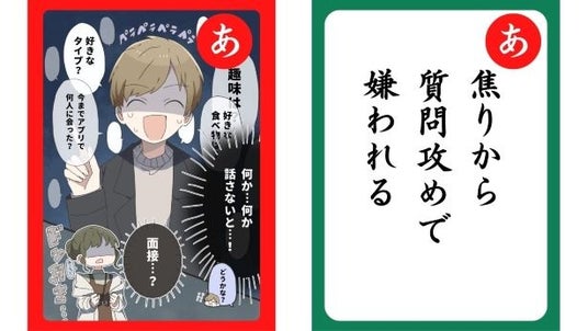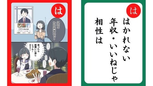 マッチングアプリにおいていいねや年収は気になるところですが、実際の相性はテキスト情報ではわからないことも多いですよね。ご自身の体験からきているのでしょうか?実感がこもった、また、明るい気持ちになる素敵なかるたで、社内でも共感を得ていたため今回最優秀賞に選ばせていただきました。(OmiaiPR担当)