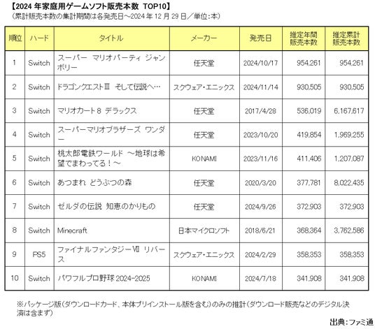 パッケージソフト市場では、『スーパー マリオパーティ ジャンボリー』(任天堂/2024年10月17日発売/Switch)が95.4万本を売り上げ、年間ソフトランキングのトップに立ちました。特に年末の需要で大きく販売を伸ばしています。