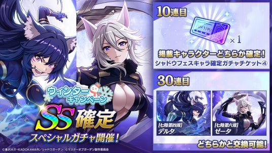 10連目に獲得できるチケットで、[七陰第四席]デルタまたは[七陰第六席]ゼータのどちらかが確定で出現! さらに、30連目にはどちらかを選択して交換可能です! この機会をお見逃しなく!